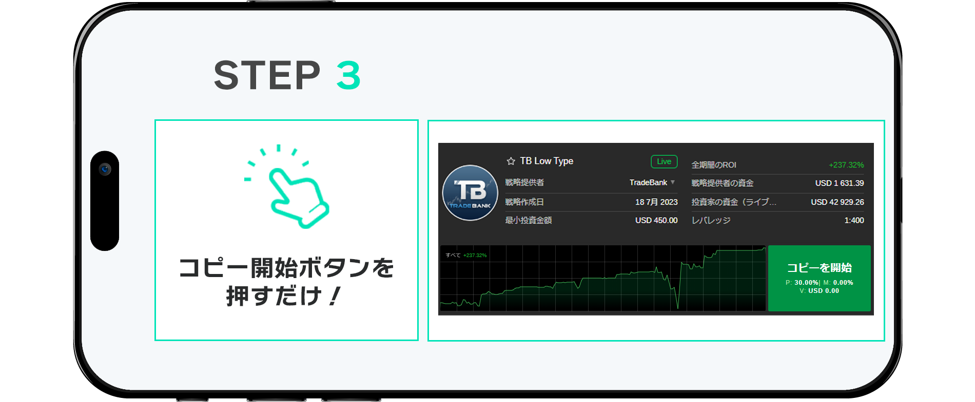 口座への入金が終わったら、コピートレードのページでTB Low Typeを選択し、自身の投資金額を入力し「コピーを開始」を押すだけ!